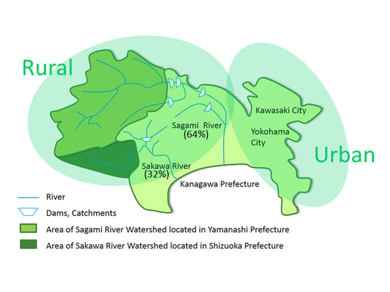 Kanagawa Prefecture is home to 9.2 million people, half of whom live in two major cities, Yokohama and Kawasaki, which account for only 24% of the prefecture’s land area. The western part of the prefecture is a rural and mountainous area that has a declining and aging population. The water supply of the urban areas of Kanagawa prefecture is sourced from these rural and mountainous areas. As shown in Figure 1, these water catchments provide nearly 96% of the water supply of the urban areas, meeting the water demands of the domestic, industrial, and service sectors (Kanagawa Prefecture, 2015).