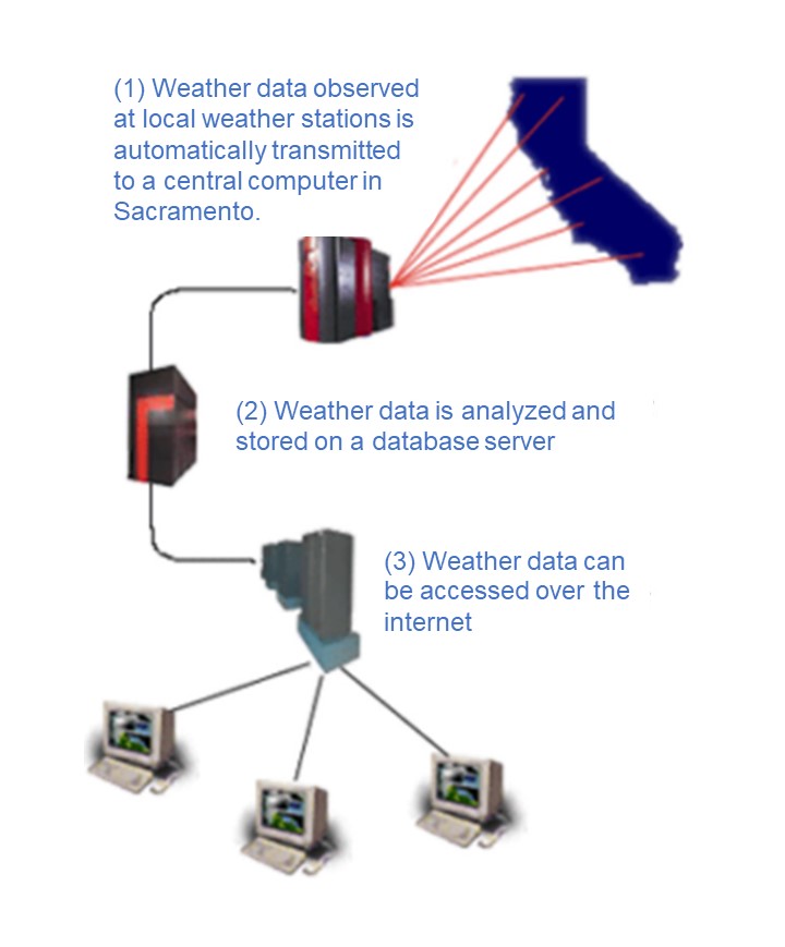 Farmers need to consider the timing and extent of irrigation. To help with this, irrigation forecasting systems called CIMIS (California Irrigation Management Information System), are provided by the State of California (Fig. 1). In this system, weather data collected by different observation stations are automatically collated and stored on a database server and is analyzed by a central computer. Users can access weather data via the Internet (Fig. 2).
