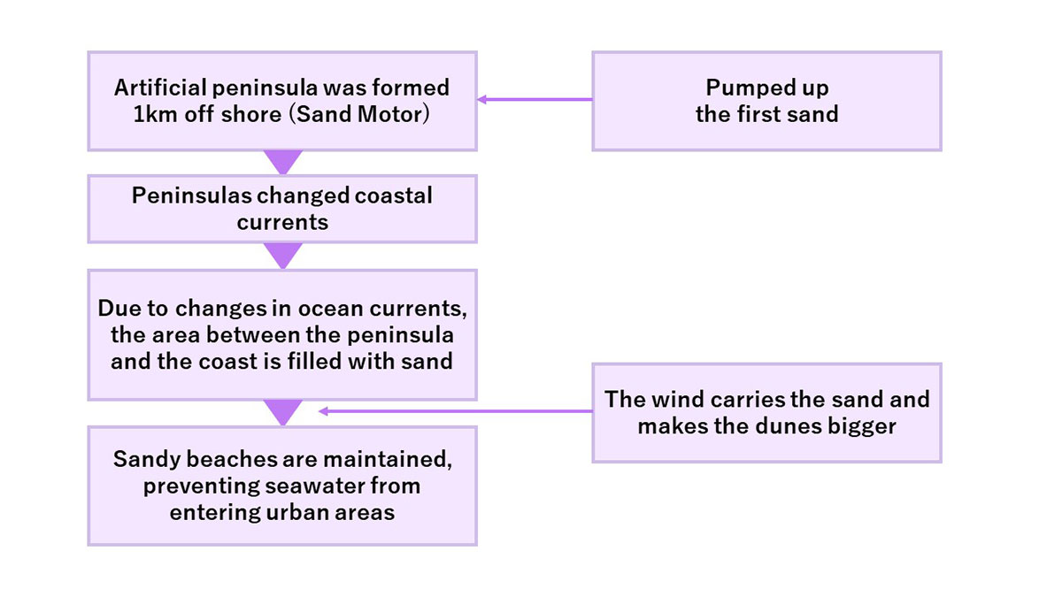 The Sand Motor project was devised to counteract the damages caused by rising sea levels. Based on the concept of “building coasts through natural methods,” the objective is to regenerate lost coastline by gradually redistributing sand over time through wind, wave, and tidal motion.