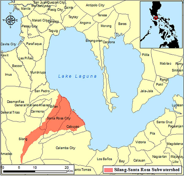 Against this background, the Institute for Global Environmental Strategies (IGES) conducted a pilot project focusing on the effects of land-use changes on flood risk in order to help improve the local governments’ plans for land use and action on climate change. The study area is the Silang-Santa Rosa Subwatershed in the Philippines, which is located about 40 km south of Manila, the national capital. The subwatershed is adjacent to Lake Laguna, the largest lake in the country (Fig. 1). This page provides a brief explanation of the project.