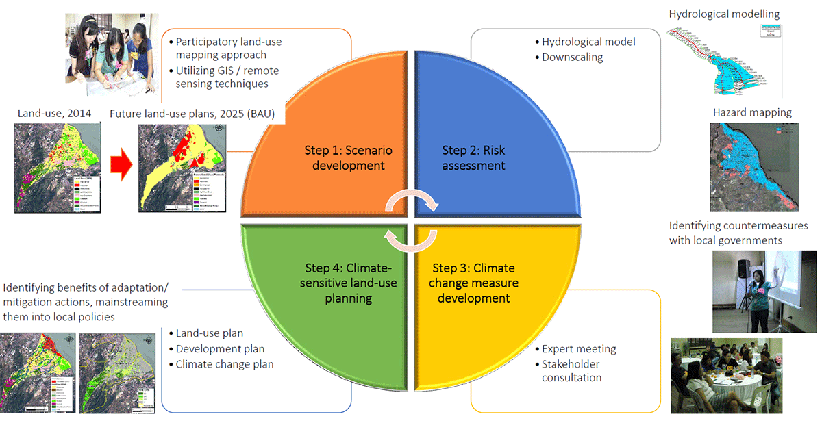 The first step, scenario analysis, attempts to understand the problems that local governments face in addressing natural disasters and other impacts of climate change, and assess the government’s development and land-use plans (Fig. 3) for the next decade (to 2025). The second step, risk assessment, involves estimating the total population at risk of flooding (e.g., because of a typhoon’s intensive rain). In the third step, the development of CCA measures is aimed at devising possible actions for adaptation in consultation with local governments. The fourth step, land-use plan improvement, intends to support local governments to strengthen their land use and related development plans through dialogue on the issues and recommendations generated from the previous three steps.