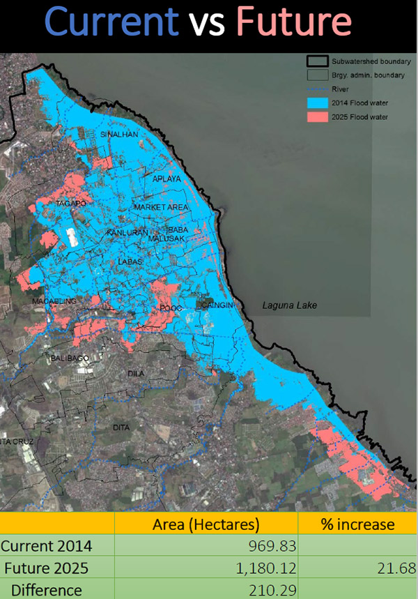 In order to estimate the number of people at risk for flooding, during the second step, runoff simulation was implemented using a basin model1 with the precipitation and discharge data from the 2012 typhoon Ofel (international name: Son-Tinh). This extreme rainfall event data was prepared by the Philippine Atmospheric Geophysical and Astronomical Services Administration. The population change projection (Fig. 4) during the years 2014 and 2025 for the smallest administrative unit (barangay), roughly equivalent to a village/ward/city district in residential areas, was used. Then the population information and the flooded area were overlaid.