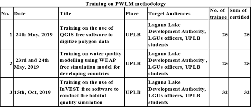 Conducted training for use of the digitised future land-use map, water quality modelling, and habitat quality modelling, through utilisation of free software (QGIS, WEAP and InVEST), which were provided to LLDA and LGUs officials in the five target watersheds in Laguna De Bay.