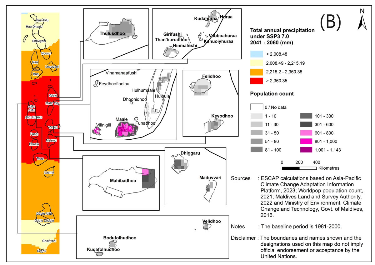 (B) Total Population Exposure to Annual Precipitation under SSP3 7.0: In this part of the figure, we illustrate the total population in the Maldives exposed to annual precipitation levels as projected under the SSP3 7.0 climate scenario for the years 2041-2060. This data provides insight into the vulnerability of the entire population to changes in annual precipitation patterns.