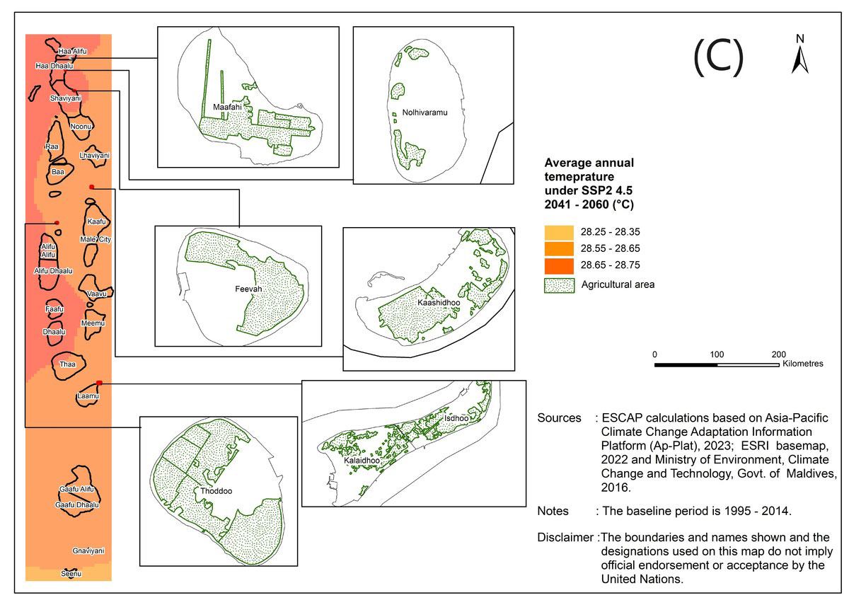 (C) Agricultural Area Exposure to Average Annual Temperature under SSP2 4.5: This segment of the figure focuses on the agricultural areas in the Maldives exposed to average annual temperature changes under the SSP2 4.5 climate scenario for the period 2041-2060. It offers information on how these climate conditions may impact agricultural practices and food security.
