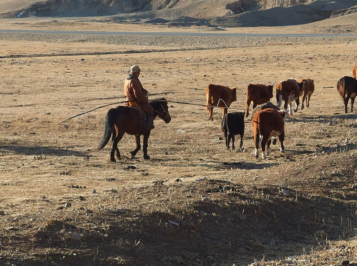 Mongolia has very hot summers and extremely cold winters. During severe dzud winters, deep snow and frozen ground prevent livestock from reaching pasture for grazing, leaving herding families without feed and causing animal deaths. Climate change is making dzuds more frequent and intense, while increasingly hot summers reduce pasture quality and the animals’ fat reserves for winter. Overgrazing has also increased with the country’s shift to a free-market economy.