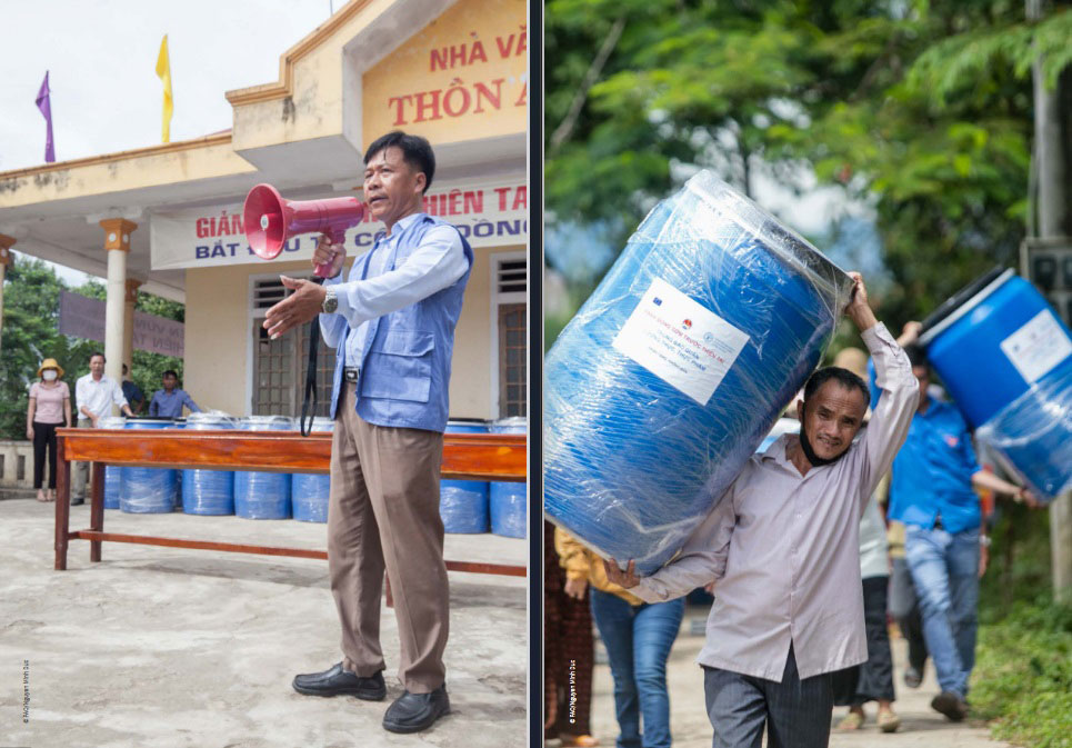 The FAO anticipatory action approach in Vietnam uses resource distribution and financial aid to assist households through natural disasters. Its preemptive actions – such as distributing watertight drums – help prevent the loss of assets that would be financially difficult for these households to replace.